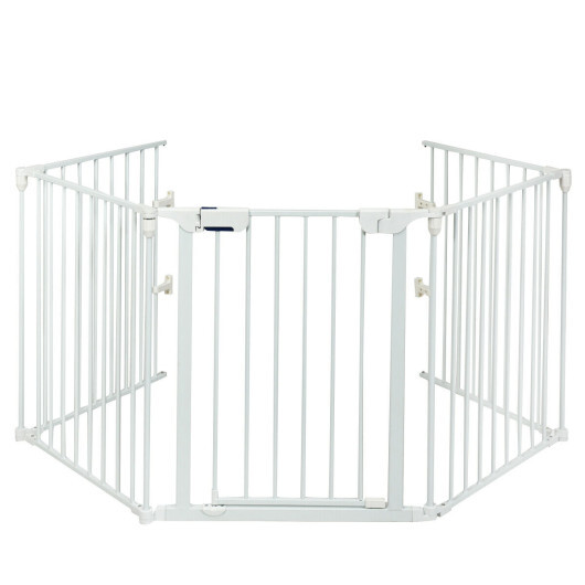 Crafted from heavy-duty steel with exclusive finish this gate has sturdy and durable structure for long time service. Designed with a walk-through door with safety lock it provides ultimate security and easy to open with one hand. It has 5 panels that can be made into any shape you want. This multifunctional gate is perfect for any indoor environment such as doorway hallway and grills. You can set it freely on floor or mounted to the wall in order to create space where the baby or pet can play safely by themselves.
