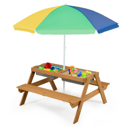 3-in-1 Kids Outdoor Picnic Water Sand Table with Umbrella Play Boxes-Yellow – Color: Yellow