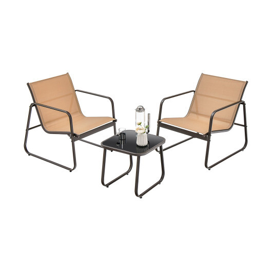 3 Pieces Patio Conversation Set with Breathable Fabric and Tabletop-Brown – Color: Brown