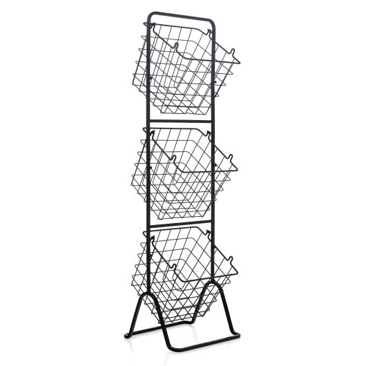 This 3-tier market basket stand provides sufficient room to stock up on various items. It can organize vegetables and fruit in your kitchen classify snack bags in the living room assort laundry detergent near the washing machine not to mention store other sundries. The wire basket features a tilted hanging design for easy fetch and is easy to remove for independent use. It is easy to connect the frame and hang up the baskets then the assembly is finished! This fruit basket stand converts to 3 height forms — 1-basket 2-basket and 3-basket which is an ideal organizing solution for specific needs. The stable triangle metal base and rounded corner will ensure safe use.