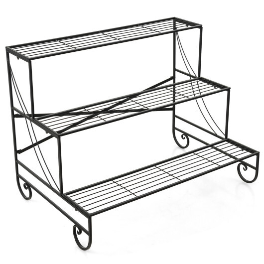 3-Tier Mental Plant Stand with Grid Shelf – Color: Black