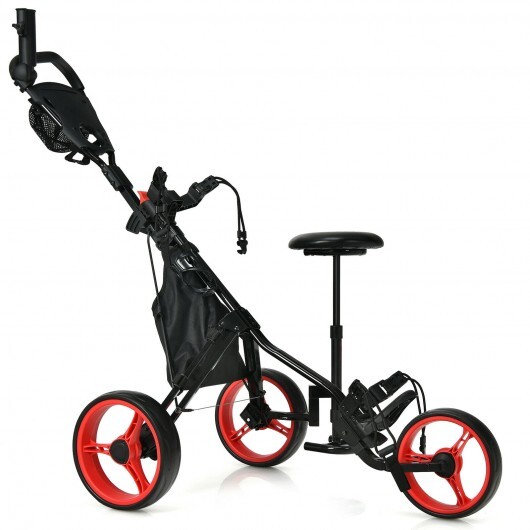 3 Wheels Folding Golf Push Cart with Seat Scoreboard and Adjustable Handle-Red – Color: Red