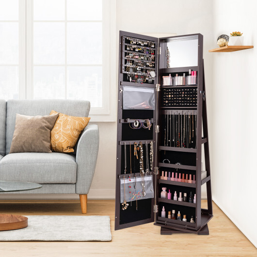 360?° Rotatable 2-in-1 Lockable Jewelry Cabinet with Full-Length Mirror-Dark Brown – Color: Dark Brown