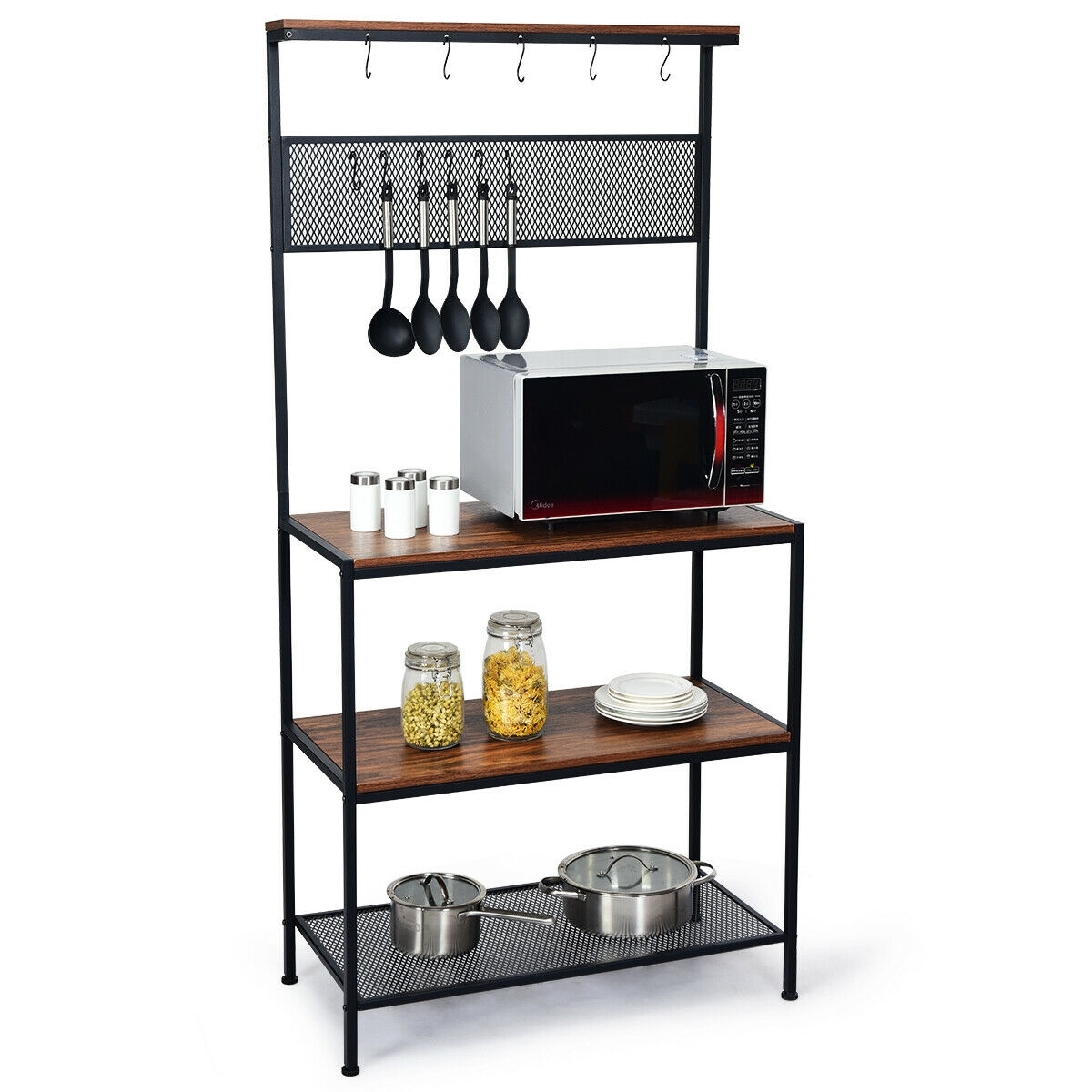 4-Tier Kitchen Rack Stand with Hooks and Mesh Panel – Color: Brown