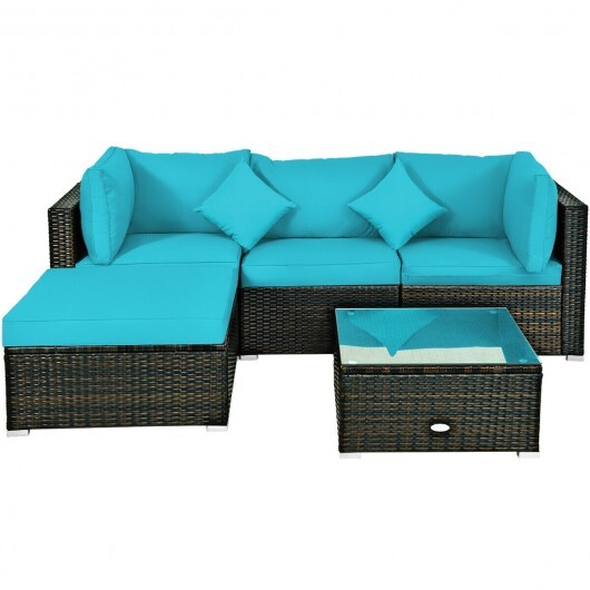 5 Pcs Outdoor Patio Rattan Furniture Set Sectional Conversation with Navy Cushions-Turquoise – Color: Turquoise