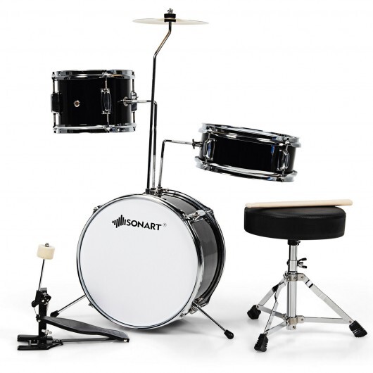 The drums have 9-layer hardwood shells with premium drum skin to play a beautiful drumbeat. And the cymbal which is forged by stainless steel shows a crisp and clear sound. Including a tome drum a snare drum a bass drum and a cymbal this drum set has everything you need to encourage your little drummer. It is suitable for starters who just show interest in music or the promising young drummers as well. The strong electroplated drum lungs and stands hold the instruments sturdily. And this set comes with 2 hardwood drumsticks a bass pedal and a height-adjustable seat. Besides this drum set has a high gloss finish which will look fantastic on a stage or in your hom.