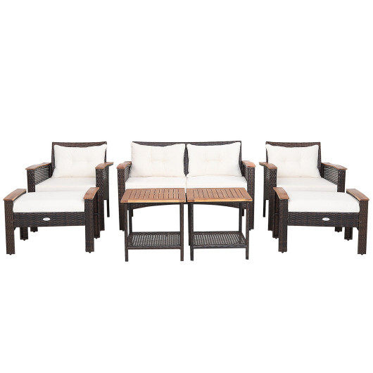 Specifications: Color of PE Rattan: Mix Brown Color of Cushion: Off White Material: PE Rattan Acacia Wood Steel Polyester Sponge Overall Dimension of Loveseat: 29.5″ x 51″ x 31.5″ (L x W x H) Overall Dimension of Each Table: 20″ x 20″ x 20″ (L x W x H) Overall Dimension of Each Chair: 29.5″ x 29″ x 31.5″ (L x W x H) Overall Dimension of Each Ottoman: 19″ x 29″ x 19″ (L x W x H) Seat Height from the Ground: 14″ Dimension of Each Back Cushion: 16″ x 23″ x 5″ (L x W x Thickness) Dimension of Each Seat Cushion: 22.5″ x 22.5″ x 3″(L x W x Thickness) Dimension of Each Ottoman Cushion: 18″ x 23″ x 3″ (L x W x Thickness) Net Weight of Loveseat: 30 lbs Net Weight of Each Table: 9 lbs Net Weight of Each Chair: 20 lbs Net Weight of Each Ottoman: 12 lbs Weight Capacity of Loveseat: 710 lbs Weight Capacity of Each Tabletop: 100 lbs Weight Capacity of Each Storage Shelf: 22 lbs Weight Capacity of Each Chair: 350 lbs Weight Capacity of Each Ottoman: 350 lbs Package Includes: 1 x Loveseat 2 x Tables 2 x Chairs 2 x Ottomans 2 x Ottoman Cushions 4 x Back Cushions 4 x Seat Cushions 1 x Instruction