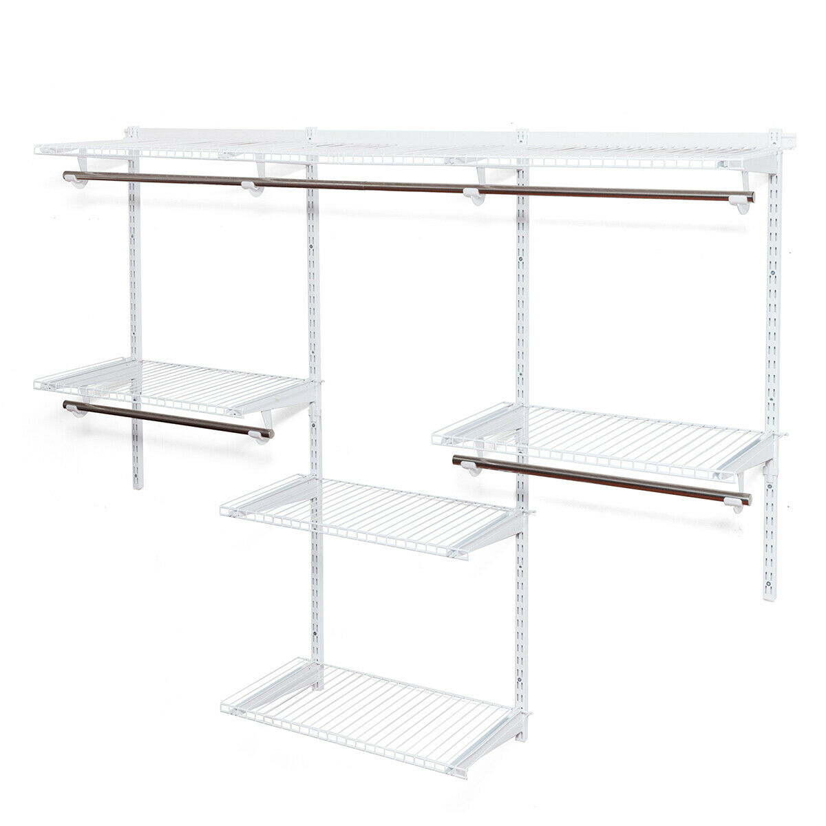 Specifications: Material: Steel Color: White Net weight: 28.5 lbs Overall dimension: Varies by assembly method Package includes: 6 x Shelf 8 x Wall strip 12 x Bracket 2 x Hang track 8 x Rod hanger & hanger widget 4 x Hanging rod 4 x Hang track cover strip 4 x Wall strip joiner 22 x Screws 19 x Anchors