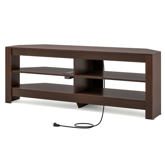 Corner TV Stand with Power Outlet and 4 Open Storage Shelves-Brown - Color: Brown