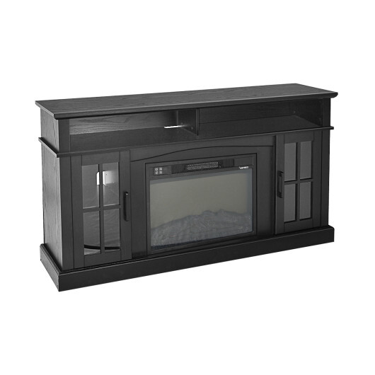 Specifications: Color: Black/Gray/Brown/White Material: Engineered wood + MDF + steel + tempered glass + plastic Overall dimension of TV stand: 58″ x 16″ x 32″ (L x W x H) Overall dimension of electric fireplace: 24.17″x5.10″x17.52″” (W x D x H) Cord length: 6 ft Total net weight: 110 lbs Weight capacity of countertop: 66 lbs Weight capacity of each open shelf: 33 lbs Weight capacity of each upper shelf in the cabinet: 20 lbs Weight capacity of each bottom shelf in the cabinet: 22 lbs Rated power: 1400W Voltage: 120V Frequency: 60Hz Heat output: 5000 BTU Heating range: 400 Sq. Ft Heating sound: <50 dB Adjustable flame brightness: 3-level Adjustable temperature: 62F-82F Timer control: 30 Mins/1 H/2 H/3 H/4 H/5 H/6 H Effective control distance of remote control: 13 ft Package includes: 1 x TV Stand 1 x Electric fireplace 1 x Remote control 1 x Instruction