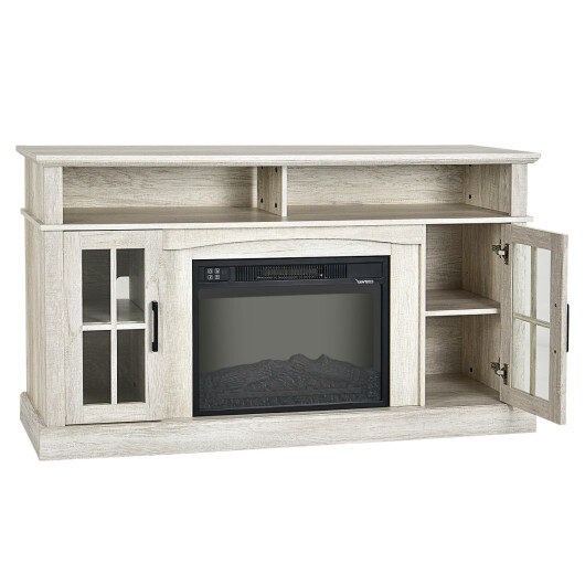 Specifications: Color: Black/Gray/Brown/White Material: Engineered wood + MDF + steel + tempered glass + plastic Overall dimension of TV stand: 58″ x 16″ x 32″ (L x W x H) Overall dimension of electric fireplace: 24.17″x5.10″x17.52″” (W x D x H) Cord length: 6 ft Total net weight: 110 lbs Weight capacity of countertop: 66 lbs Weight capacity of each open shelf: 33 lbs Weight capacity of each upper shelf in the cabinet: 20 lbs Weight capacity of each bottom shelf in the cabinet: 22 lbs Rated power: 1400W Voltage: 120V Frequency: 60Hz Heat output: 5000 BTU Heating range: 400 Sq. Ft Heating sound: <50 dB Adjustable flame brightness: 3-level Adjustable temperature: 62F-82F Timer control: 30 Mins/1 H/2 H/3 H/4 H/5 H/6 H Effective control distance of remote control: 13 ft Package includes: 1 x TV Stand 1 x Electric fireplace 1 x Remote control 1 x Instruction