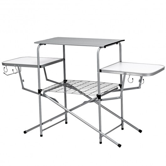 -Large tabletop 2 side shelves and lower shelf offer enough space for all of your cooking gear