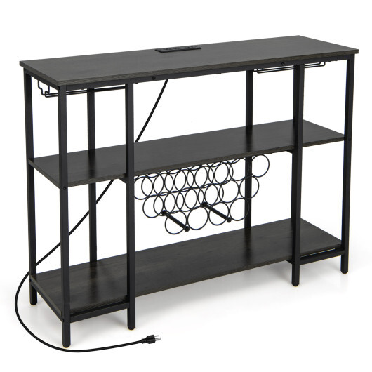 Specifications: Color Brown/Gray Material Engineered Wood Metal Overall Dimension 44.5″ x 14″ x 33.5″ (L x W x H) Coutertop Dimension 44.5″ x 14″ Net Weight 42 Ibs Load Capacity of Countertop 220 lbs Load Capacity of Middle Shelf 110 lbs Load Capacity of Bottom Shelf 88 lbs AC Outlets 125V/12A USB Ports 5V/2A Power Cord Length 4.7FT Hold Capacity of Wine Racks 15 bottles Hold Capacity of Cup Racks 6 cups