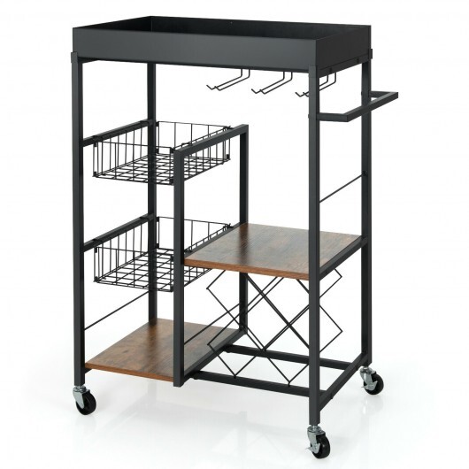 Featuring 2 shelves 2 mesh baskets a 5-bottle wine rack and a glass holder this 4-tier bar cart offers endless storage options.