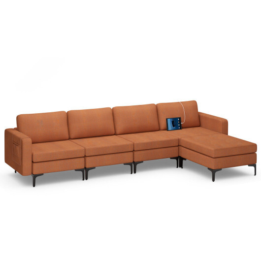 Modular L-shaped Sectional Sofa with Reversible Ottoman and 2 USB Ports-Orange - Color: Orange