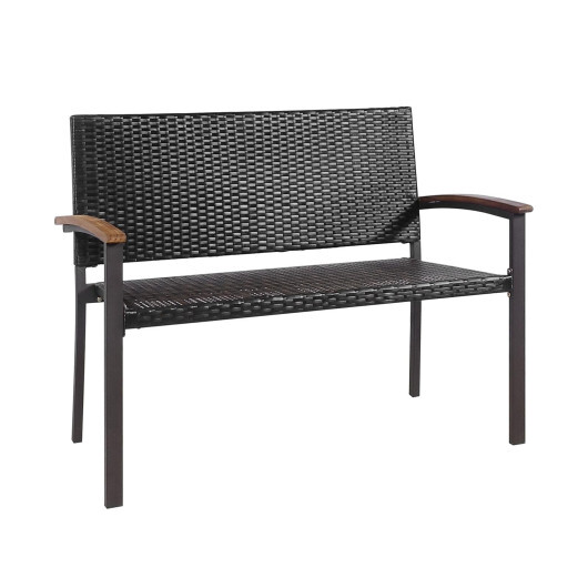 Outdoor Patio Rattan Wicker Bench with Armrest for Garden – Color: Black