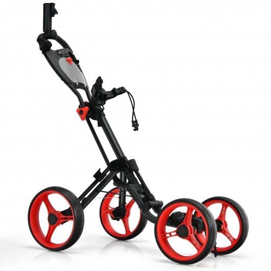 Specifications: Color: Blue/gray/green/red Material: Steel frame + PP with EVA cover wheels Overall dimension of golf trolley: 42”x 26.5” x 38”-44” (L x W x H) Foldable dimension: 42”x 26.5” x 12” (L x W x H) Diameter of front wheel: 10.5” Diameter of rear wheel: 11.5” Net weight: 15.5 lbs Max weight: 30 lb Product includes: 1 x 4 Wheel golf trolley 1 x Accessory bag 1 x Instruction